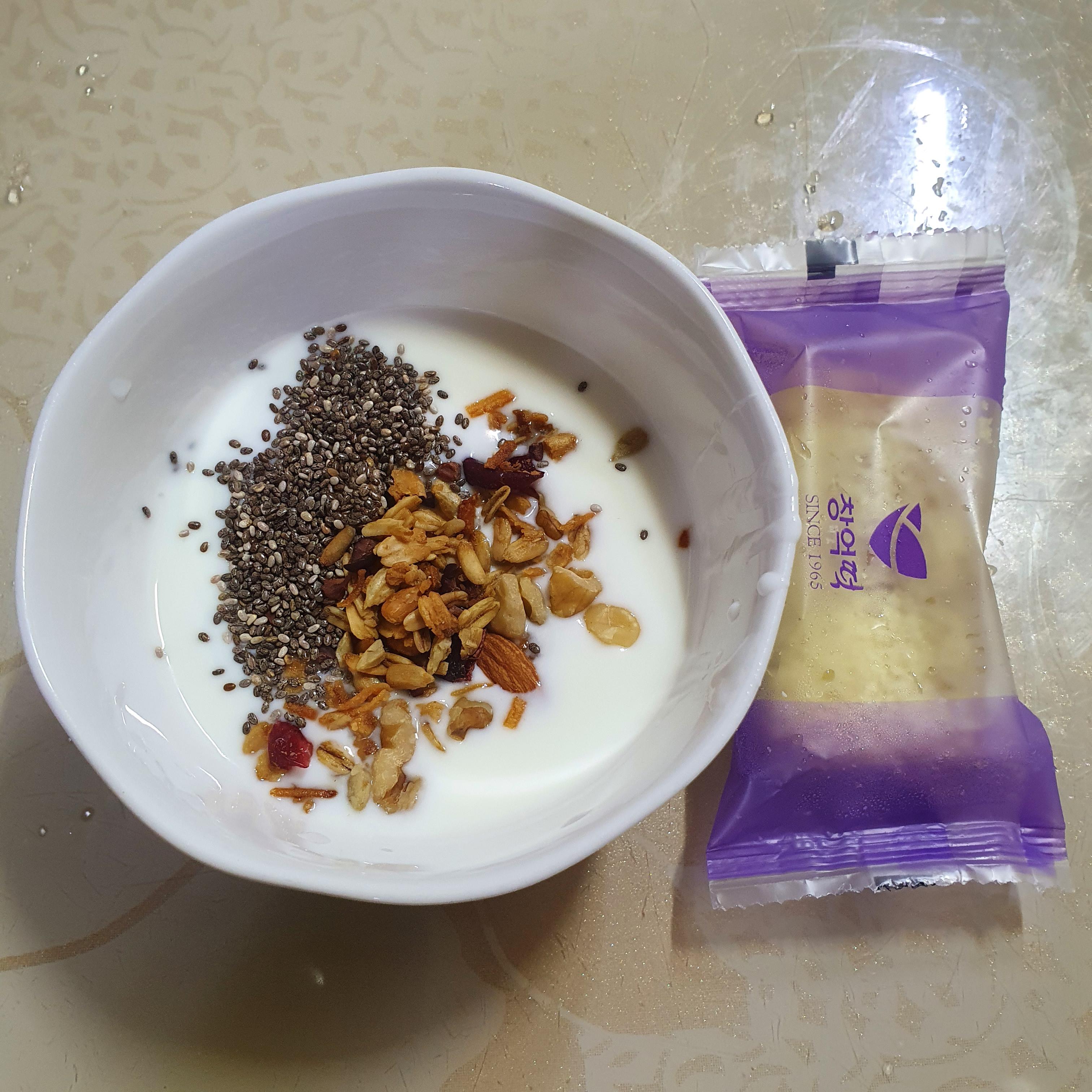 간식 겸해서 12시 반 쯔음에 먹은 그래놀라 요거트와 호박인절미 떡..