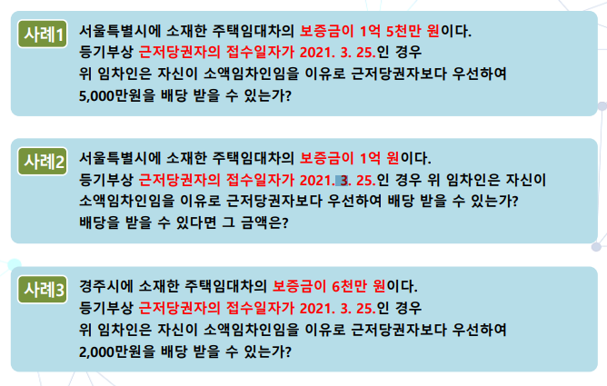 사례 3) 2021.3.25 기준, 소액임차인의 범위가 아니므로 임차인은 소액임차인 주장할 수 없음