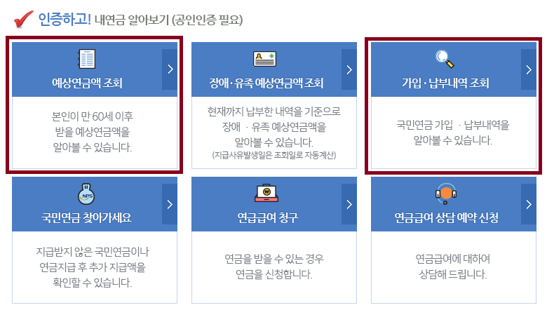 이 중에서 예상 연금액 조회와 가입/납부내역 조회를 통해