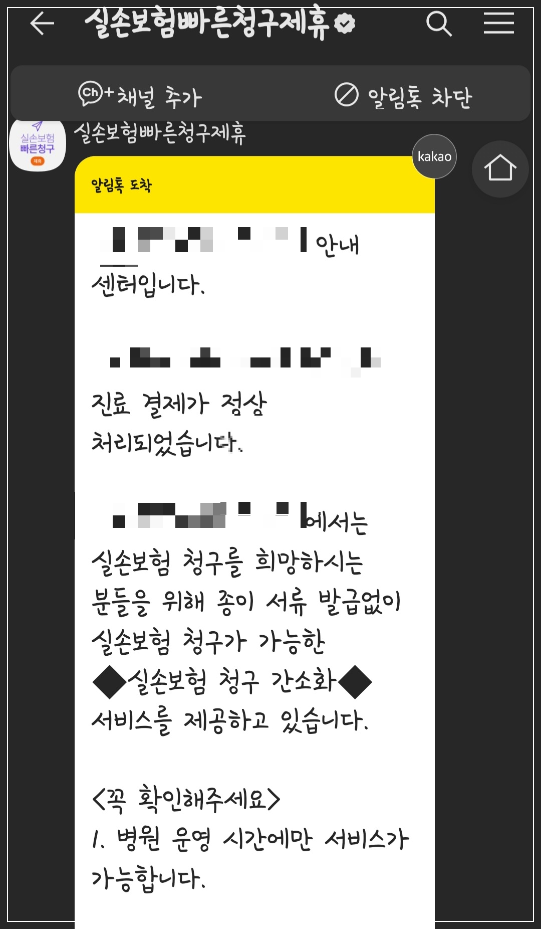 해당 병원은 간소화 제휴 병원이라며 카톡으로 보험금 청구를 할 수 있다고 하셨어요!