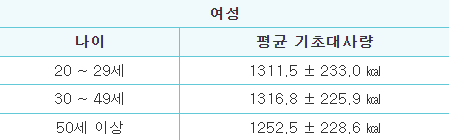 - 여성 : [665.1+(9.56*체중)+(1.85*신장)-(4.68*연령)]