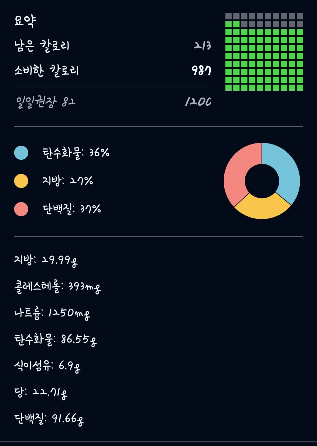 - 지방: 1,200kcalx0.3/9 = 40g (29.9g) ▶ GOOD